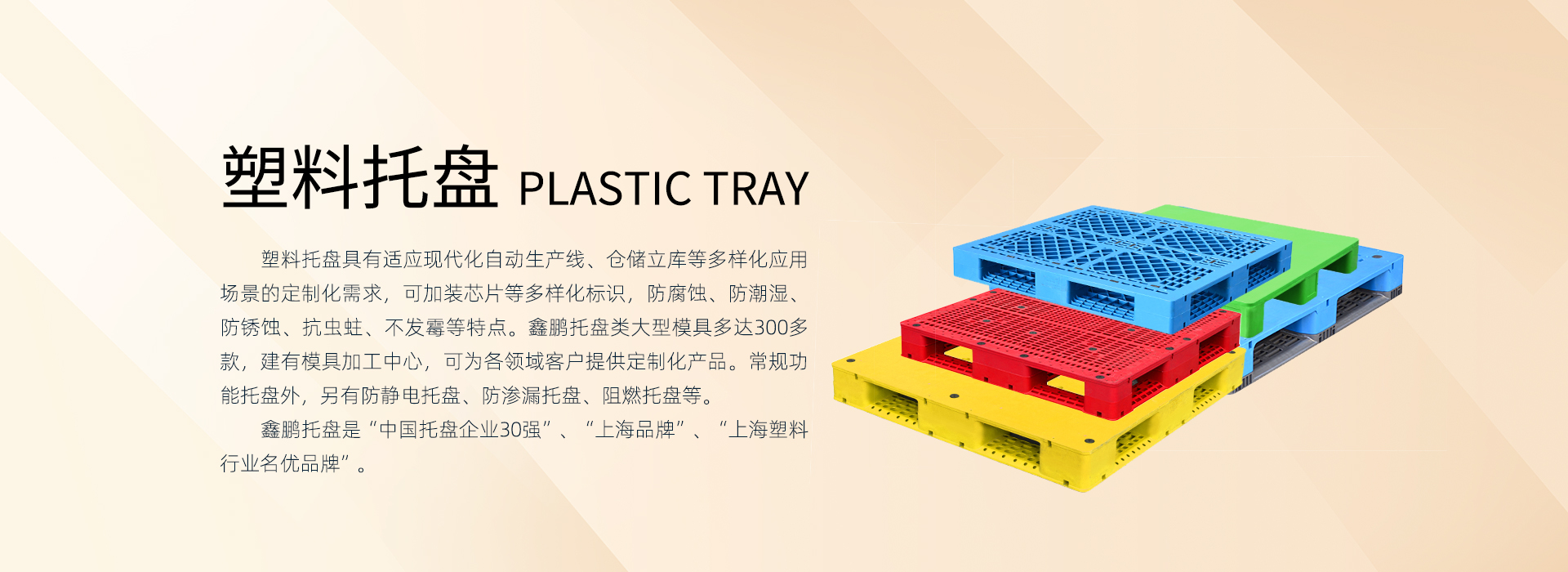 上海鑫鹏塑料创始于1987年,始终专注深根塑料产业链,业务板块包括:塑料原料贸易、塑料制品研发制造(塑料托盘、塑料箱筐、卡板箱、环卫桶等)。现全国有5个生产基地:上海2个、四川1个、江苏2个。